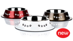 Classic:n Posh Paws punainen teräskuppi, jossa kuminen liukueste on sulautettu pohjaan, niin ettei sitä kunnolla näe.