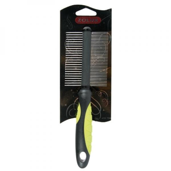 Metallinen, kaksiosainen kampa tiheällä ja harvalla puolella.