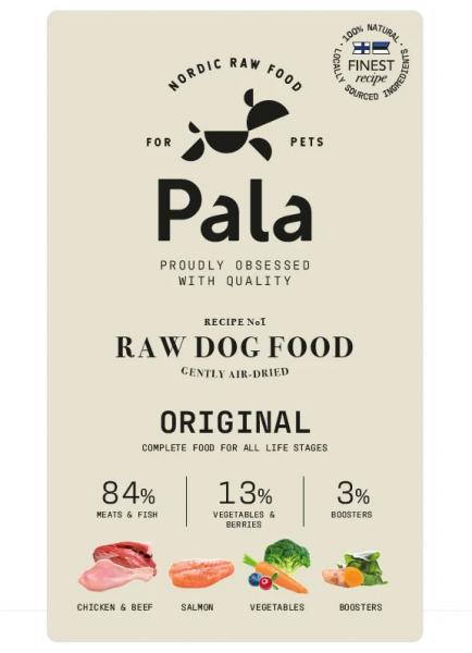 Palan täysravintoruoka reseptit sisältävät vähintään 82 % vatsaystävällisiä raakoja lihoja ja kalaa, 13-14 % kasviksia ja marjoja ja 3-4 % luonnon tehoaineita. Palassa ei käytetä lainkaan viljoja tai muita täyteaineita ja Palan rasvahapot tulevat lihasta.