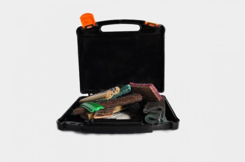 Salkussa 12 erilaista esinettä, korkkia, kangasta, nahkaa, muovia ja puuta.