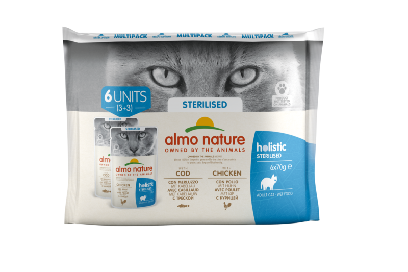 Almo Nature Holistic Sterilised 70 g: Almo Nature Holistic Sterilised on tasapainoinen märkäruoka steriloiduille kissoille. Ravinnossa on runsaasti lihaa ja korkea proteiinipitoisuus, ja sen vähärasvainen ja kuitupitoinen resepti auttaa painonhallinnassa. Almo Nature Holistic Sterilised höyrytetään hellävaraisesti, mikä säästää tärkeitä ravintoaineita. Ravinto on rikastettu vitamiineilla ja kivennäisaineilla. Gluteeniton kissanruoka sopii hyvin myös herkille ja allergisille eläimille. Ravinto ei sisällä keinotekoisia väri- tai säilöntäaineita.