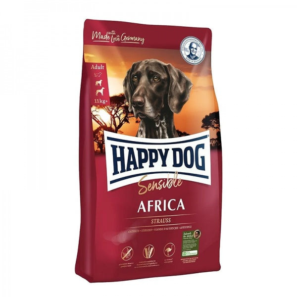 Happy Dog Africa yhdistää strutsin & perunan ainutlaatuiseksi reseptiksi. Strutsi on erittäin harvinainen proteiinilähde ja siksi ihanteellinen koirille, jotka kärsivät ruoka-aineyliherkkyyksistä. Perunoissa ei ole gluteenia ja siksi niitä suositellaan viljayliherkkyyksistä kärsiville eläimille. Arvokkaat Omega-3- ja Omega-6-rasvahapot – tärkeitä terveelle iholle ja kiiltävälle turkille – täydentävät valikoidun reseptin. Puristeet on sovitettu ihanteellisesti kaikkien keskikokoisten ja suurten koirarotujen hampaille. Valmistettu Saksassa erittäin tiukan laadunvalvonnan alaisena!