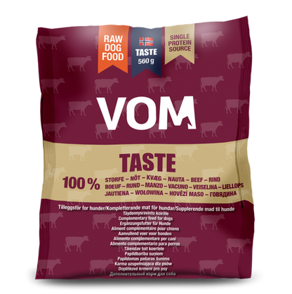 Taste Beef:iin on lisätty samat vitamiinit ja kivennäisaineet kuin VOM-täysravintoihinkin, ja tuote soveltuu myös eliminaatiodieetin toteuttamiseen sekä tarvittaessa ruoka-aineallergioista kärsivän koiran pääasialliseksi ravinnoksi.