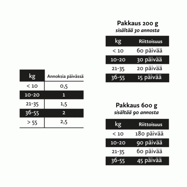 20-kiloisen koiran päiväannos sisältää: 1400 mg omega-3 EPA, ETA, DPA ja DHA sekä 600 mg glukosamiinia, 400 mg kondroitiinisulfaattia ja 50 mg luonnollista E-vitamiinia.