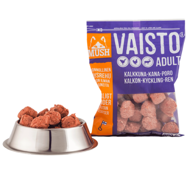 MUSH Vaisto® Liila, kana-kalkkuna-poro, on koiran täysravinto. MUSH Vaisto® Liila sopii kaikille aikuisille koirille, mutta erityisesti niille jotka tarvitsevat proteiinirikkaamman vaihtoehdon. Vaisto Liilan luumäärä on 8 %, maksan määrä 5 %.