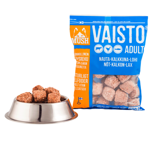 MUSH Vaisto® Sininen, nauta-kalkkuna-lohi, on koiran raaka täysravinto joka sopii kaikille aikuisille koirille, erityisen hyvin koirille joilla on iho- ja/tai turkkiongelmia. Vaisto Sinisen luumäärä on 8 %, maksan määrä 5 %.