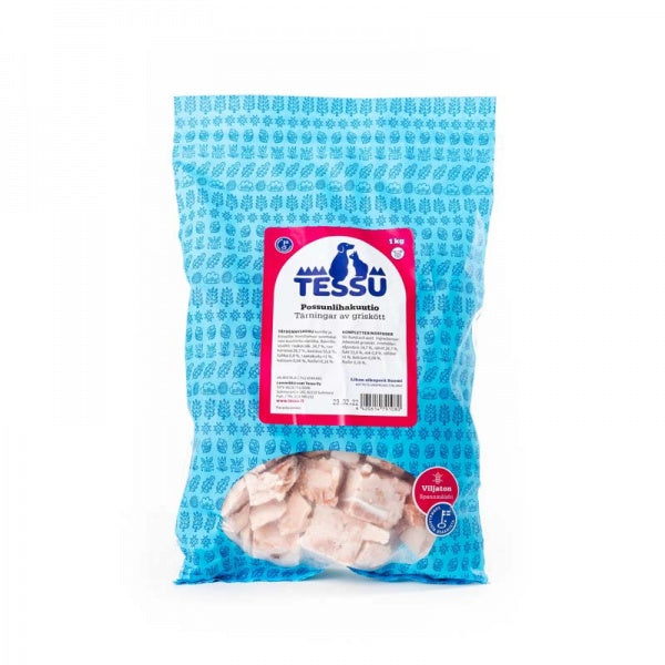 Tessu Possun lihakuutio on raakapakastettua possun kokolihaa uudelleensuljettavassa pussissa. Näppärän kokoinen possunlihakuutio (n. 25 g/ kuutio) on kotimaista, kuutioitua täyttä sianlihaa, jossa on raakarasvaa tuhdit 26,7 %! Myös kissoille hienosti sopiva kokolihatuote.