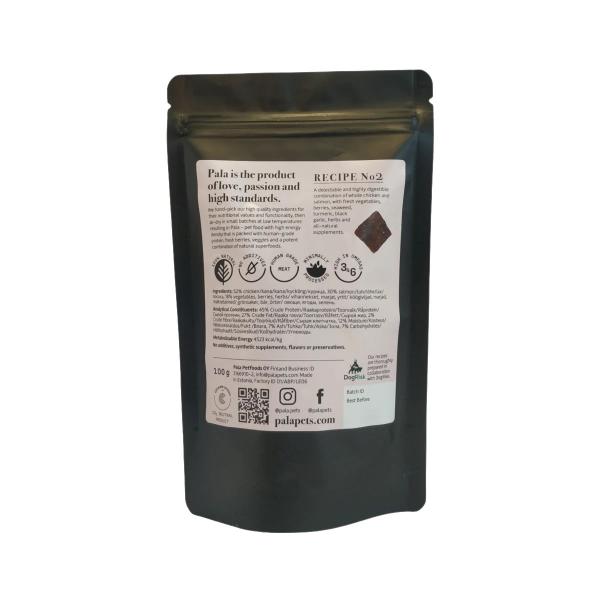 Ainekset: Kana (52 %), lohi (30 %), porkkana, punajuuri, selleri, parsakaali, merilevä, kurkuma, persilja, mustikka, karpalo, lohiöljy, vehnäoras, munankuori, musta valkosipuli, mustapippuri. Ei lisäaineita, keinotekoisia makuja tai säilöntäaineita.