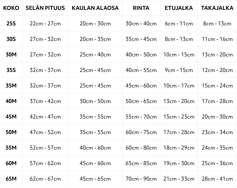 S: Peruskoko siroille, pienikokoisille ja lyhytjalkaisille koirille ja kääpiöroduille, kuten tiibetinspanielille ja jackrussellinterrierille