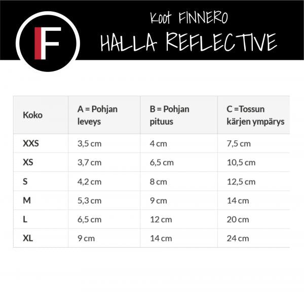 Nyt Halla-tossujen sivuihin on lisätty kaksi heijastinnauhaa (koossa XXS ja XS on yksi heijastinnauha).