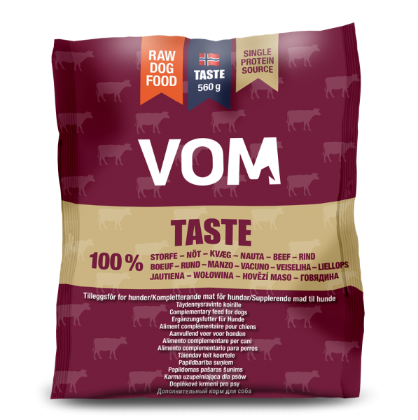 Taste Beef:iin on lisätty samat vitamiinit ja kivennäisaineet kuin VOM-täysravintoihinkin, ja tuote soveltuu myös eliminaatiodieetin toteuttamiseen sekä tarvittaessa ruoka-aineallergioista kärsivän koiran pääasialliseksi ravinnoksi.